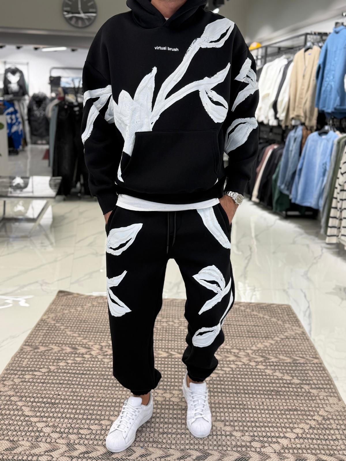 Baskı Detaylı Pamuk Eşofman Takımı Siyah