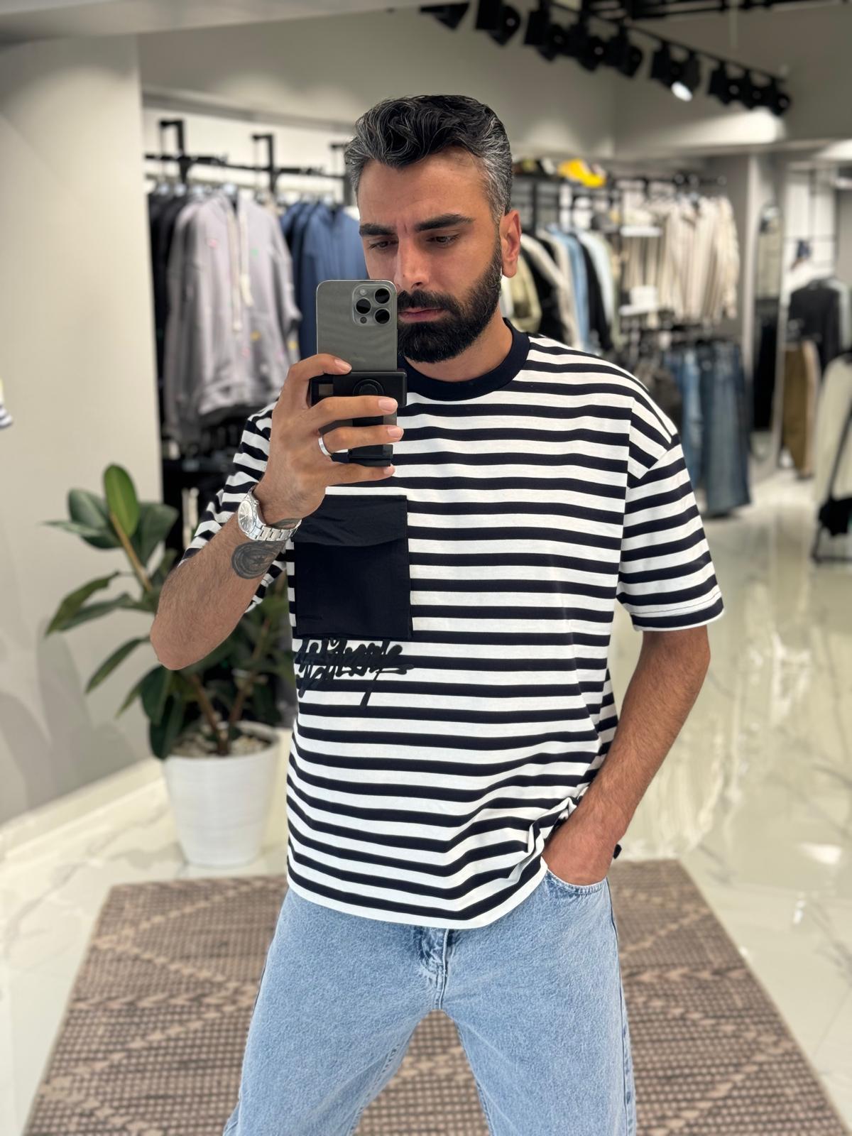 Cep Detaylı Çizgili Tişört Beyaz