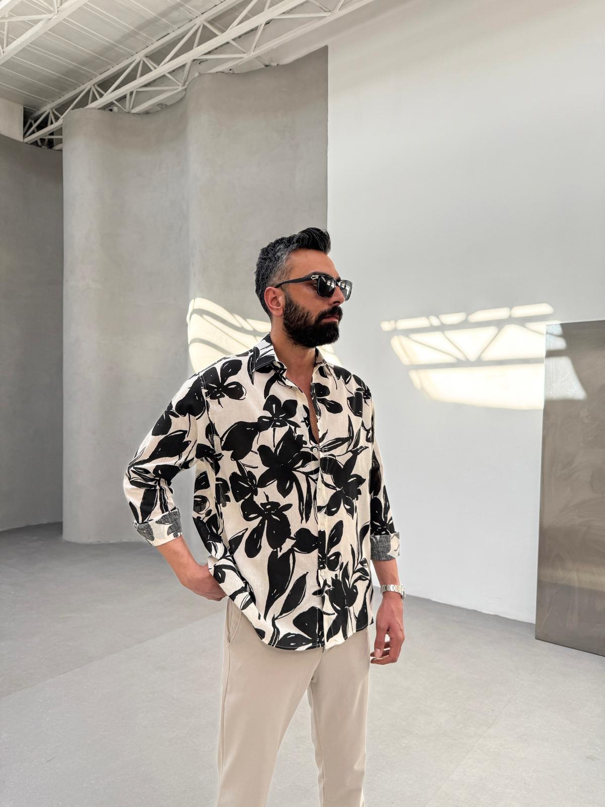 Çiçek Desenli Keten Gömlek Siyah
