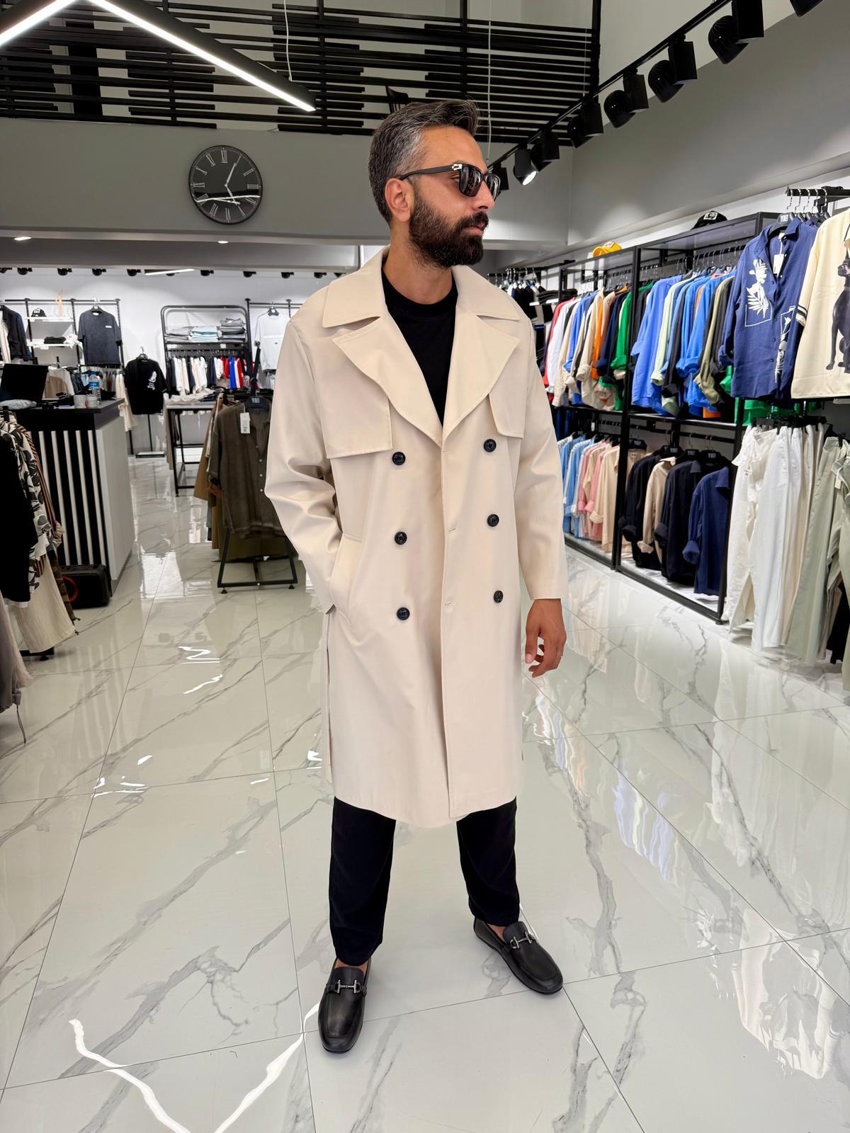 Çift Düğmeli Oversize Kalıp Trençkot Krem