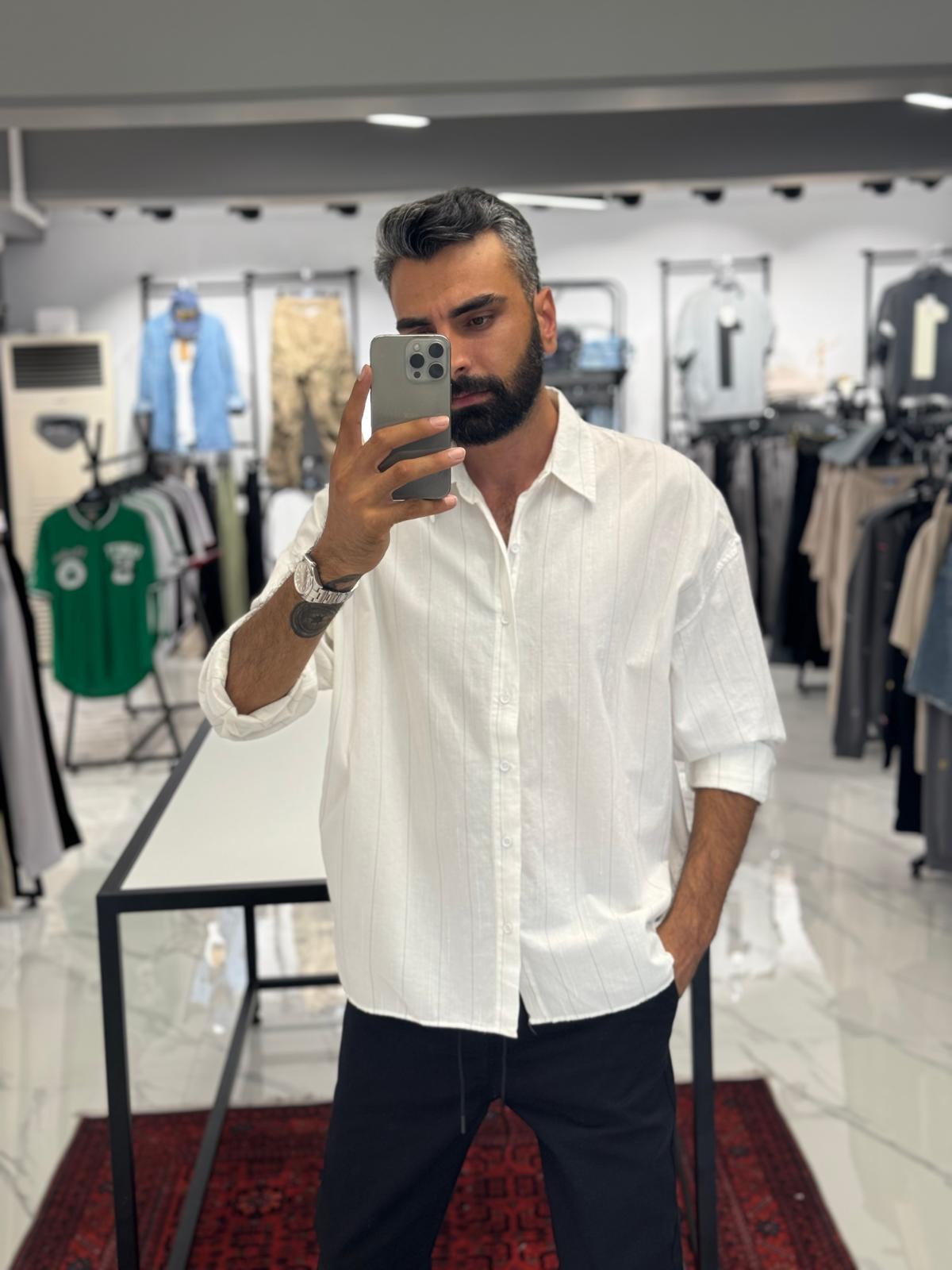 Çizgi Detaylı Rahat Kalıp Uzun Kol Gömek Beyaz