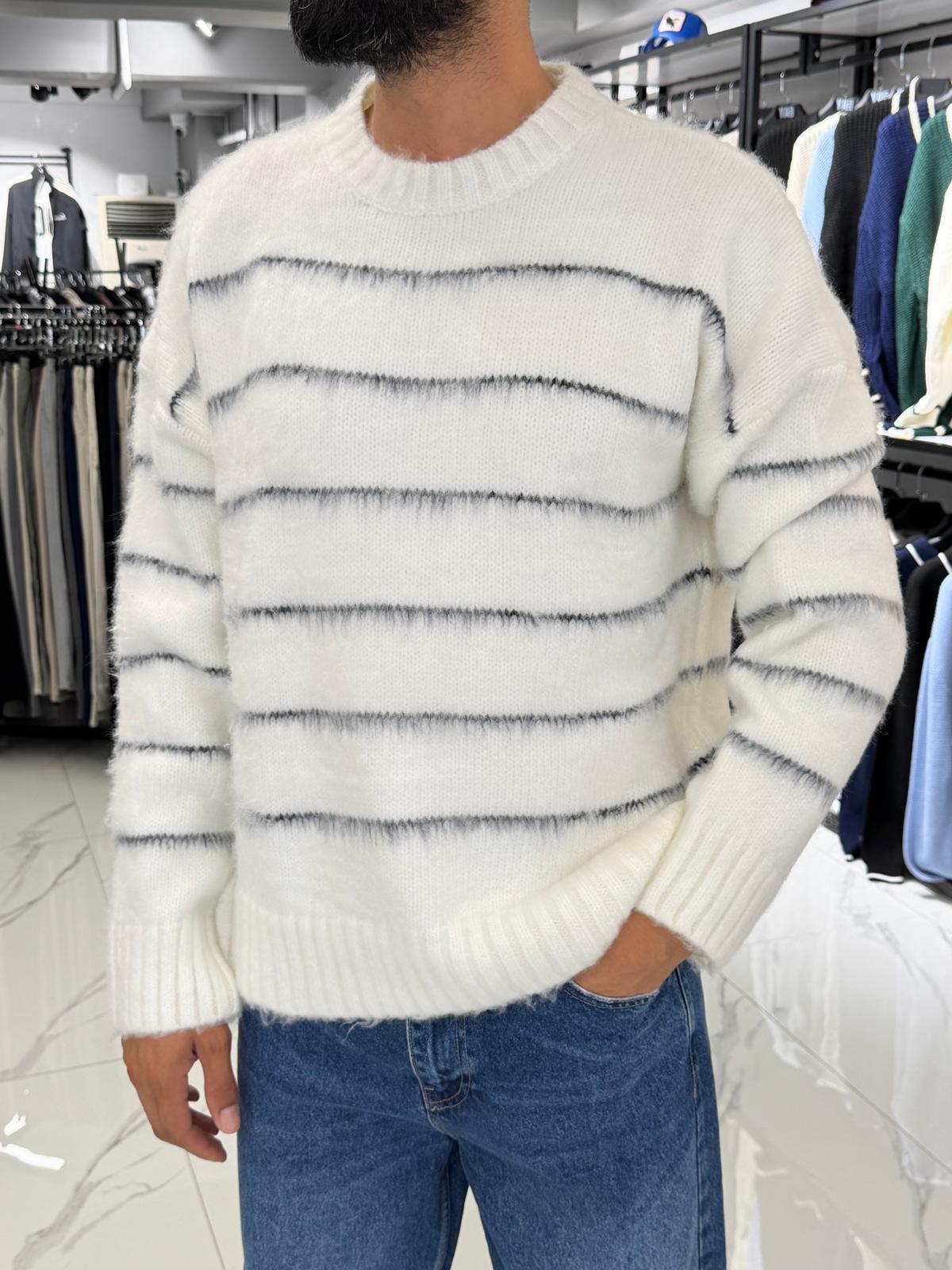 Çizgili Bisiklet Yaka Triko Kazak Beyaz