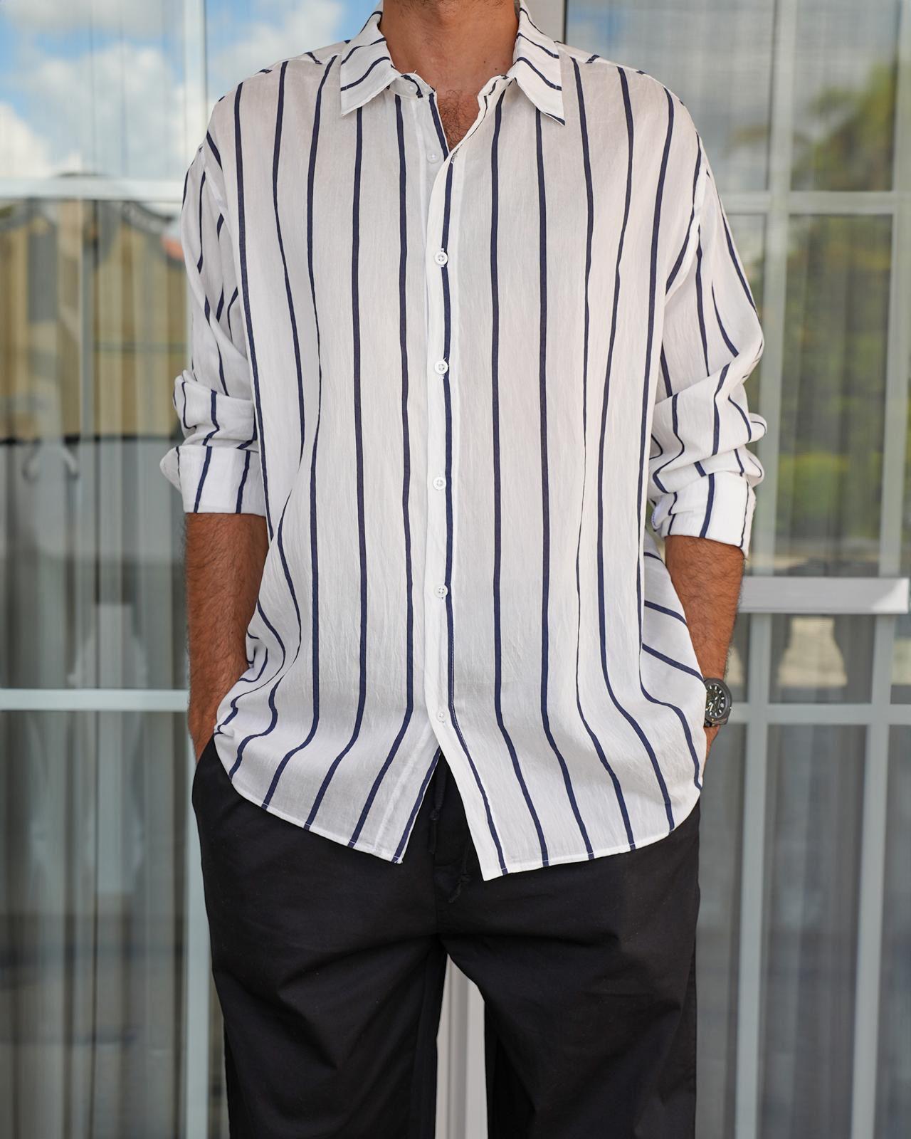 Çizgili İnce Oversize Tensel Kumaş Gömlek Beyaz