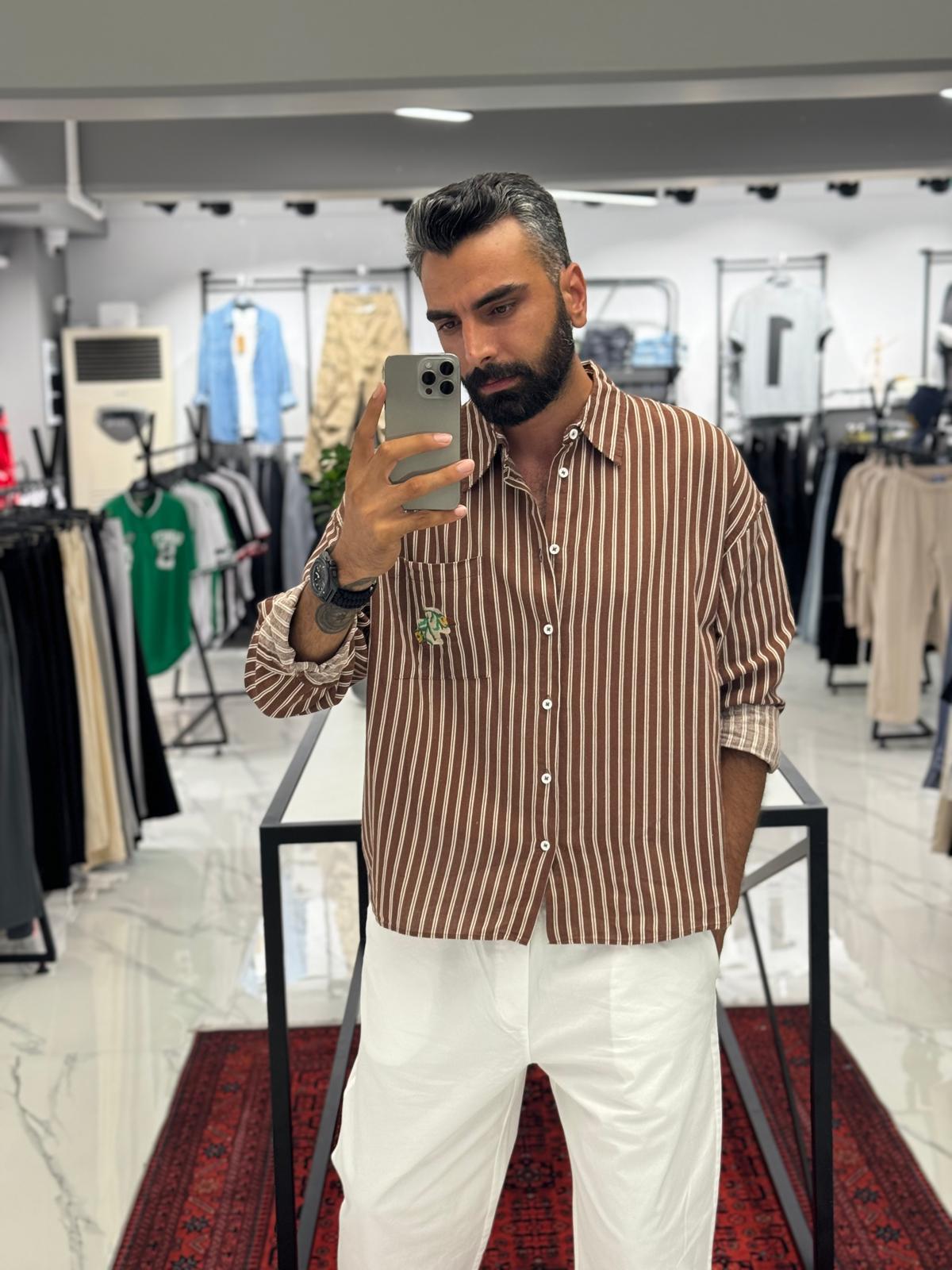Çizgili Nakış Baskı Detaylı Gömlek Kahverengi