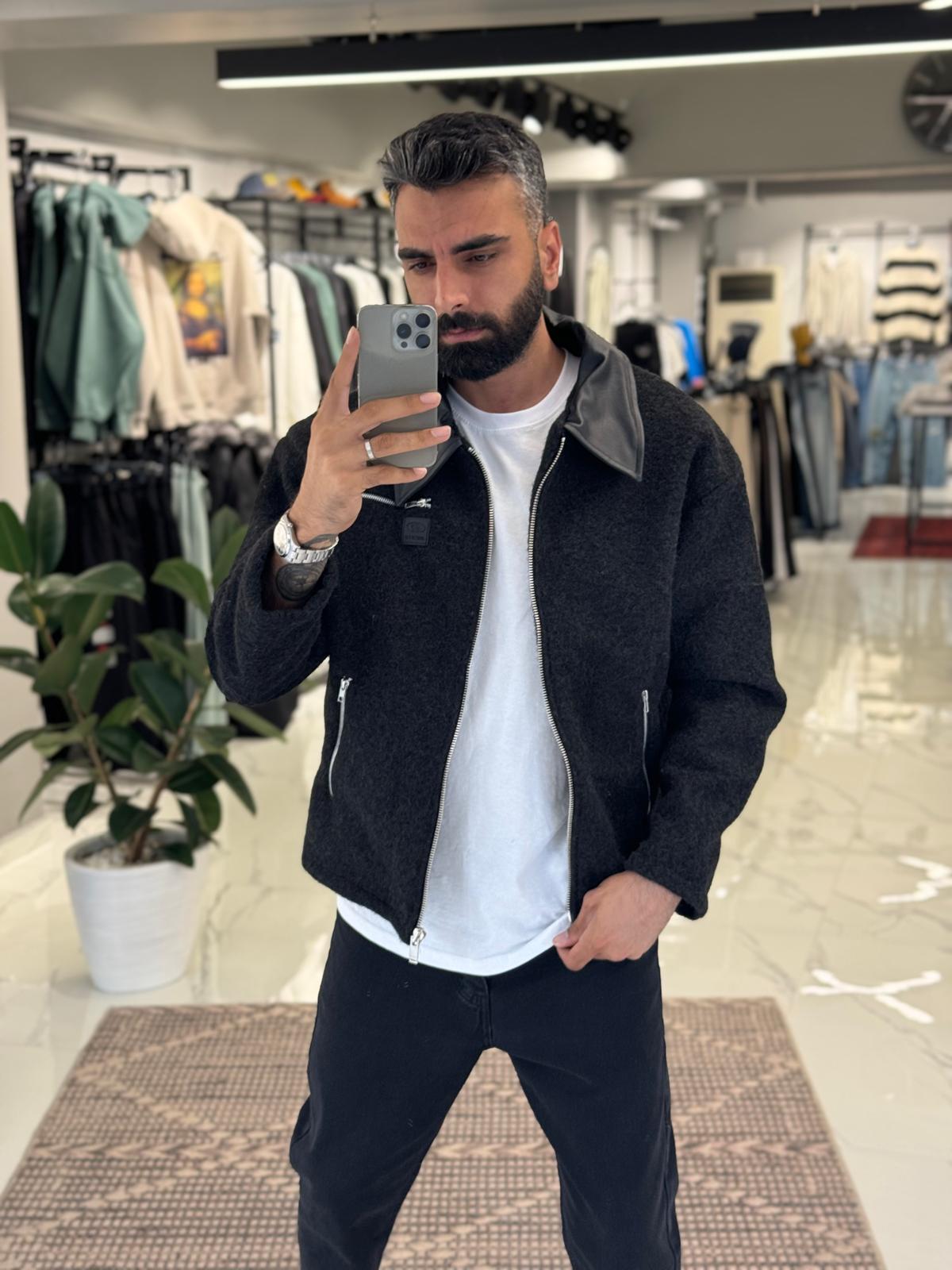 Deri Yaka Kaşe Ceket Krem Deri Yaka Kaşe Ceket Mavi