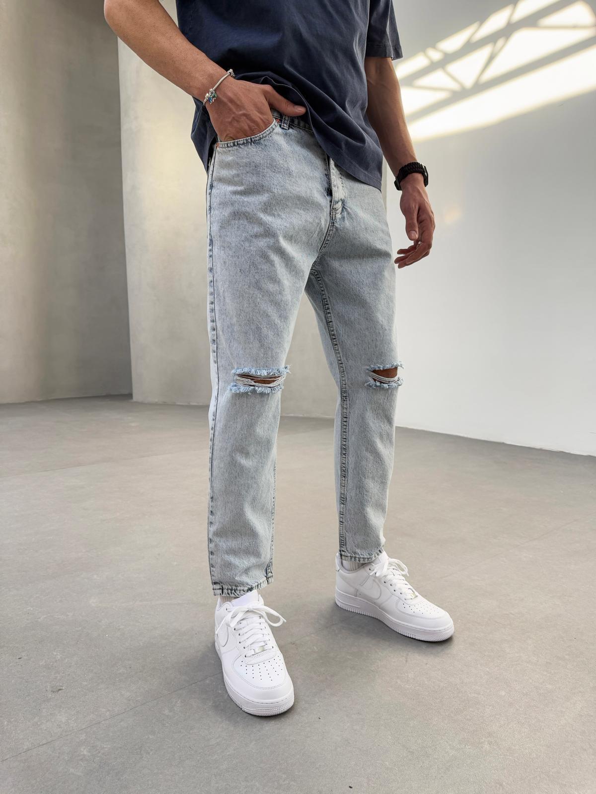 Diz Yırtık Desenli Boyfriend Jean Gri