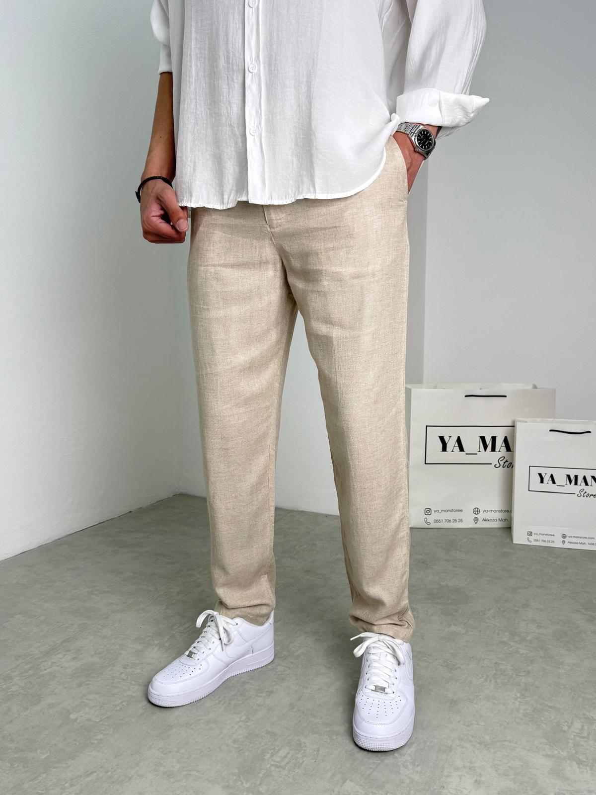 Duble Paça Keten Pantolon Bej