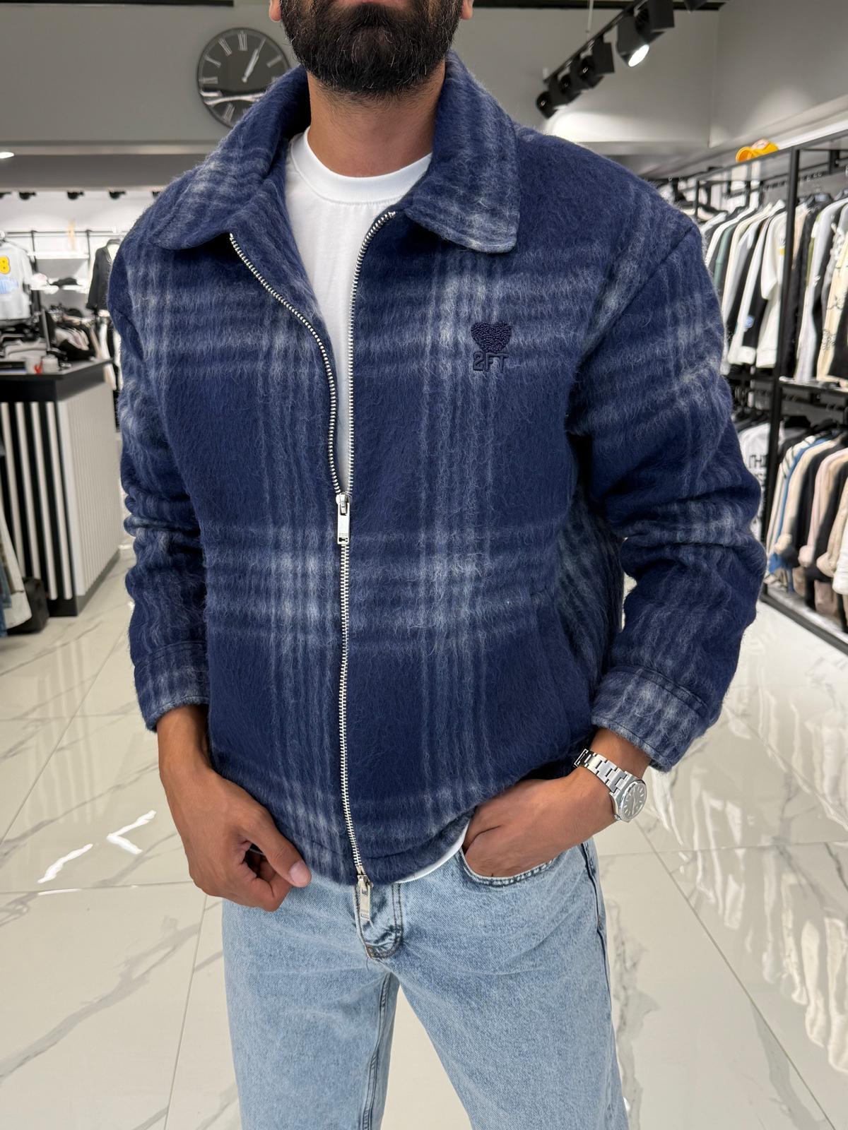 Ekose Desenli Overisize Kalıp Ceket Lacivert