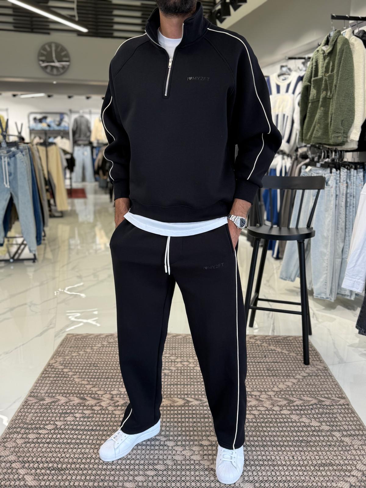 Kalın Kumaş Dik Yaka Fermuarlı Biye Detaylı Takım Siyah