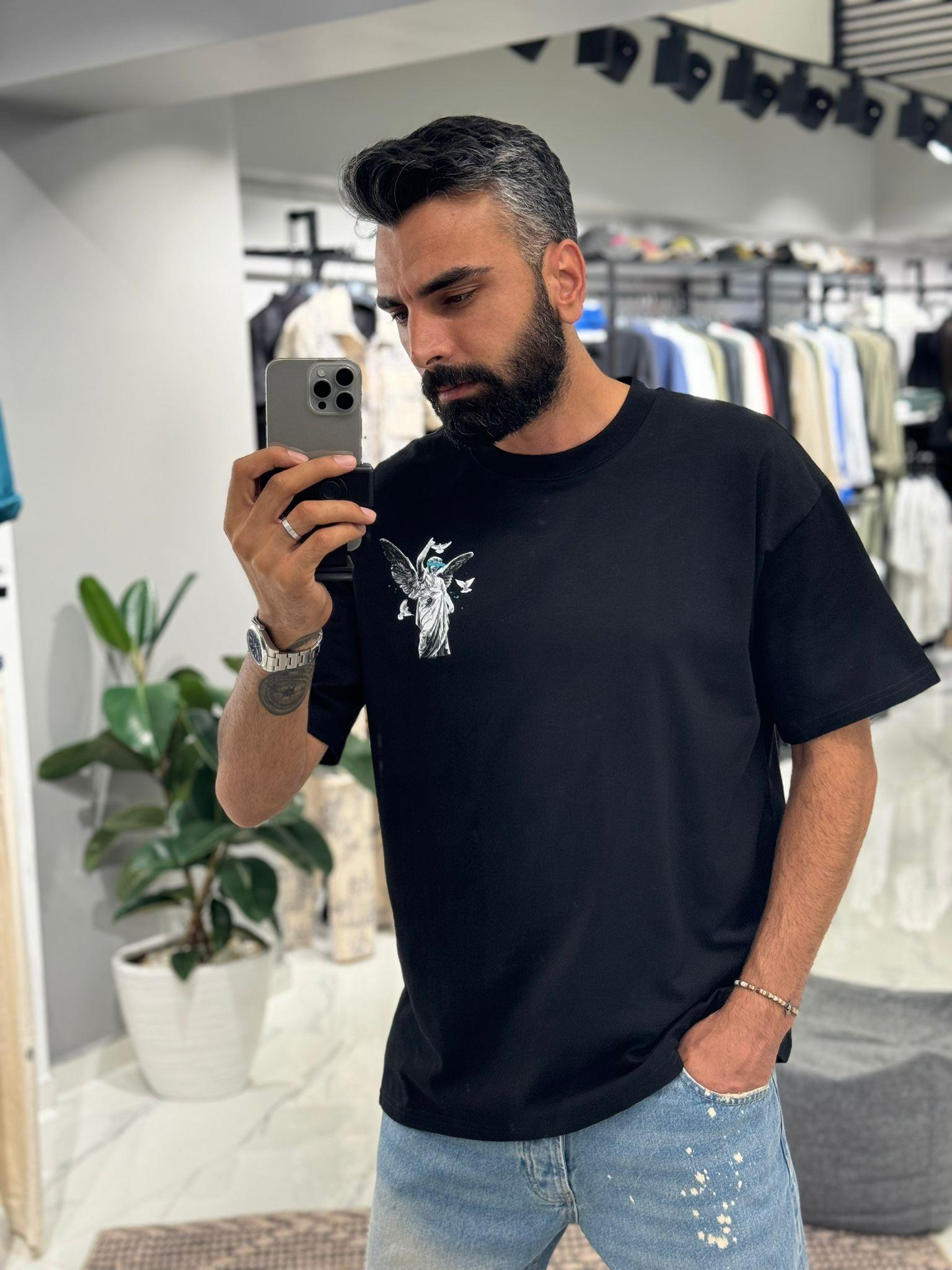 Melek Heykel Baskılı Oversize Tişört Siyah