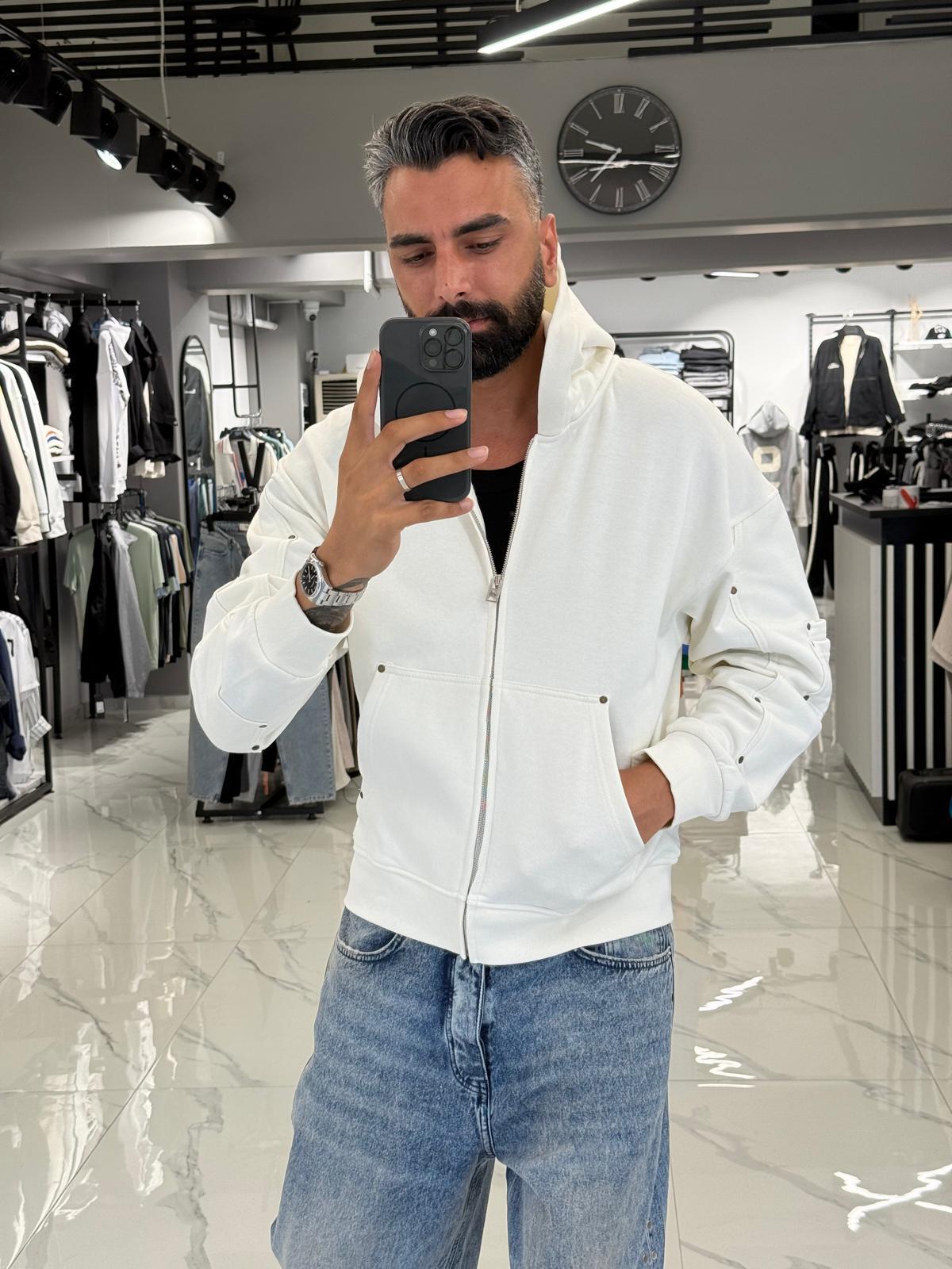 Metal İşlemeli Fermuarlı Hırka Beyaz