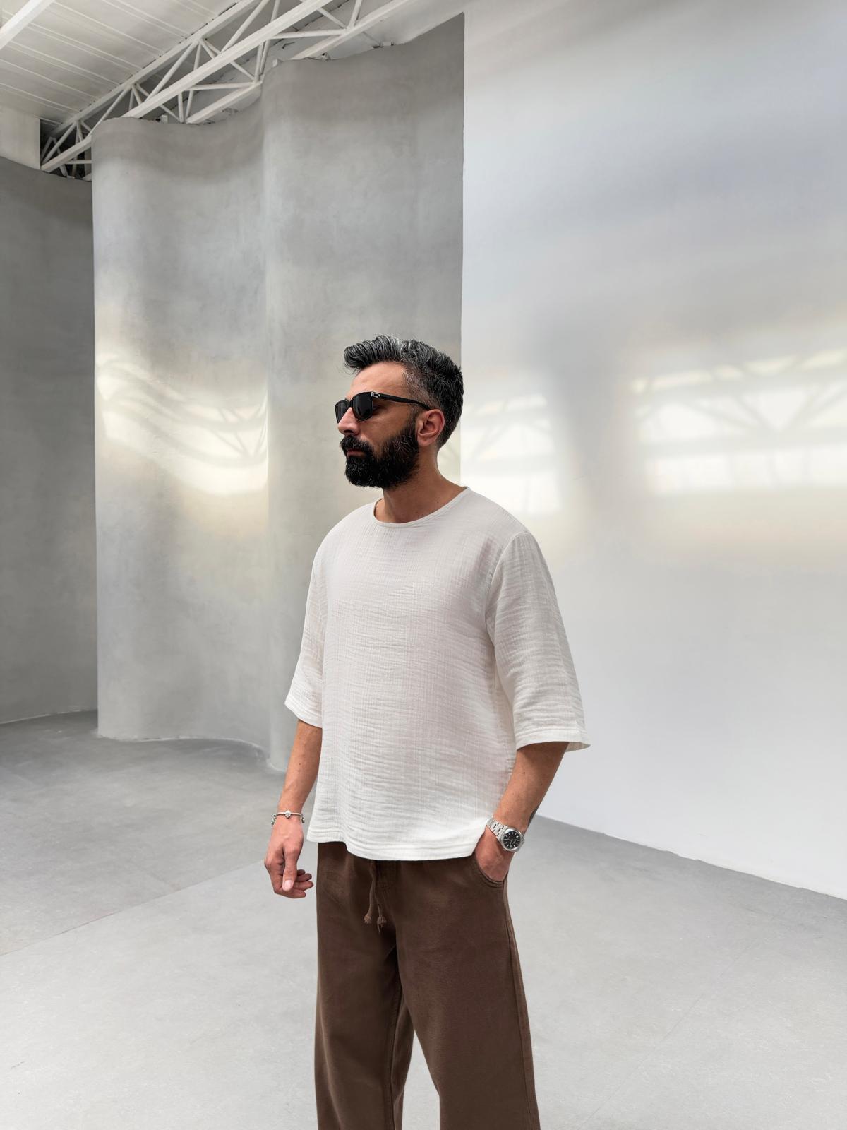 Müslin Kumaş Fakir Kol T-Shirt Beyaz