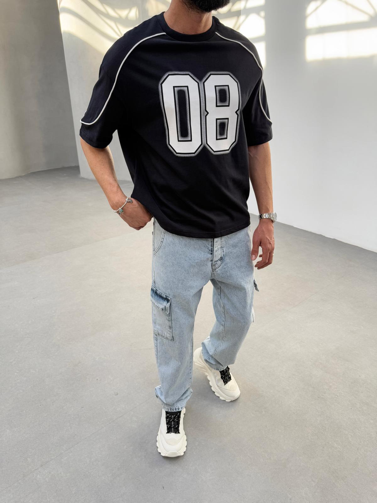 O8 Baskılı Biyeli Oversize T-Shirt Siyah