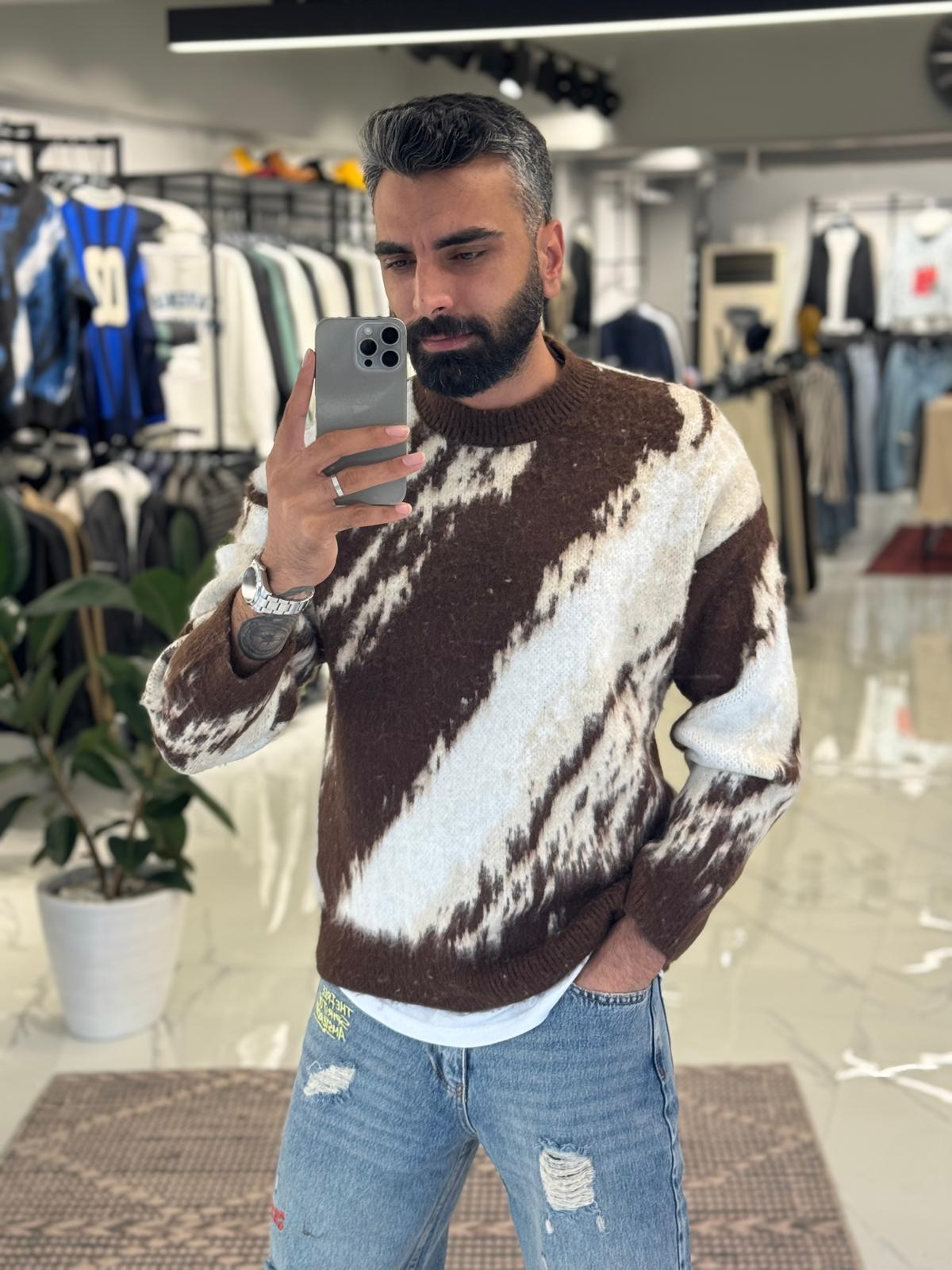 Oversize Renkli Triko Kazak Kahve