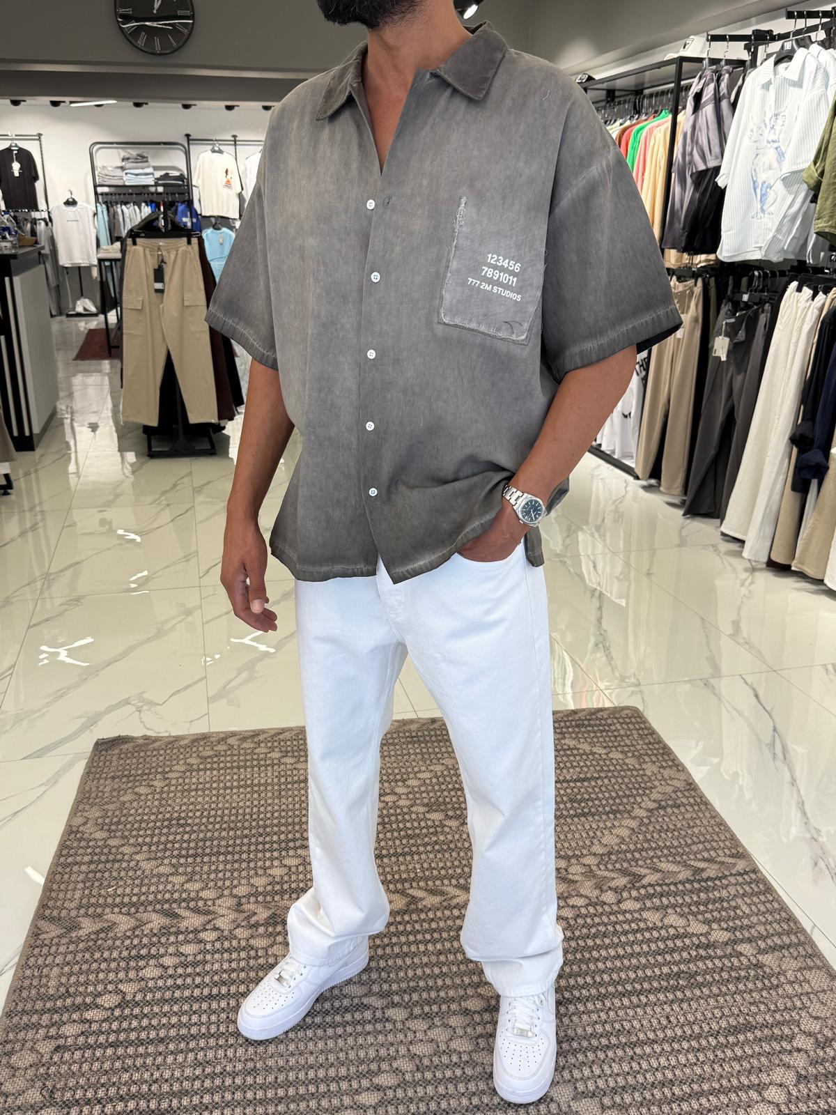 Oversize Yıkamalı Cebi Yırtık Gömlek Gri