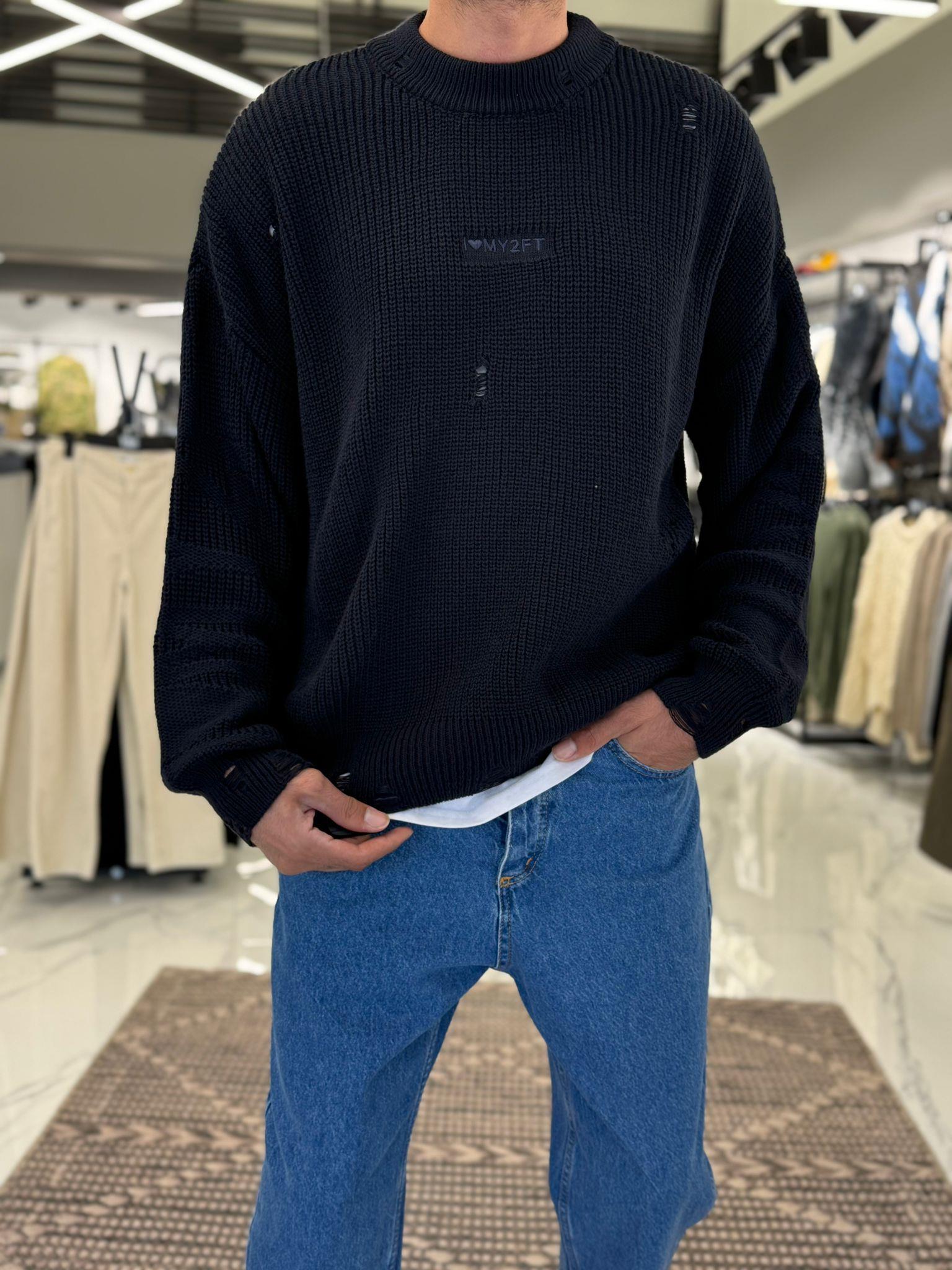 Oversize Yırtık Detaylı Örme Kazak Siyah