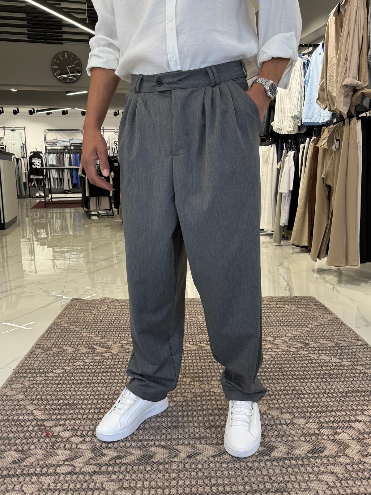 Pile Detaylı Çift Düğmeli Baggy Kalıp Kumaş Pantolon Gri