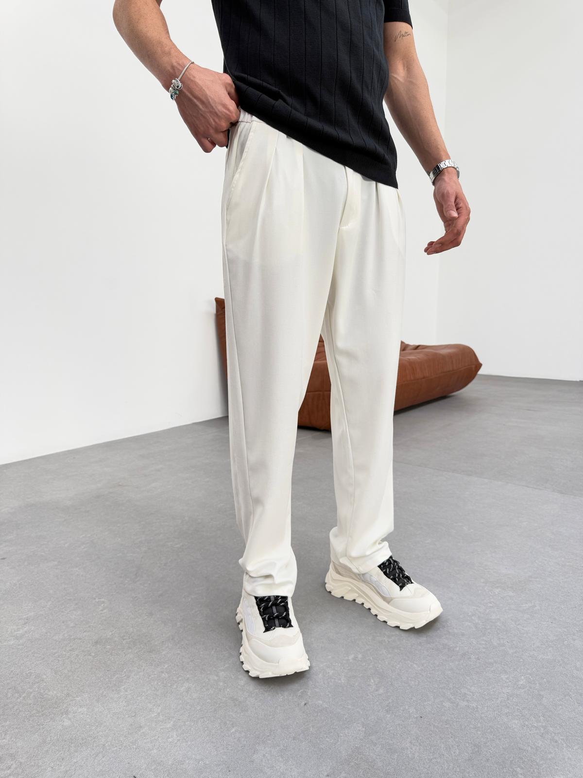 Pileli Baggy Kalıp Kumaş Pantolon Beyaz