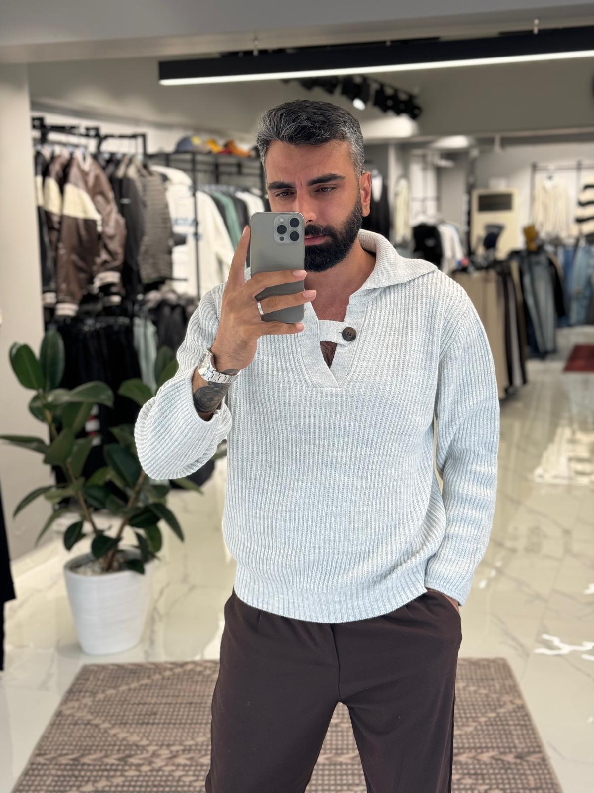 Polo Yaka Düğme Detay Triko Gri
