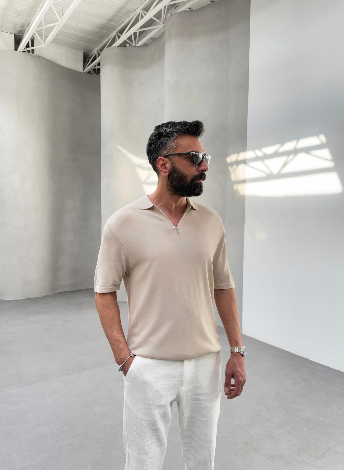 Polo Yaka Yarım Fermuar Tişört Bej