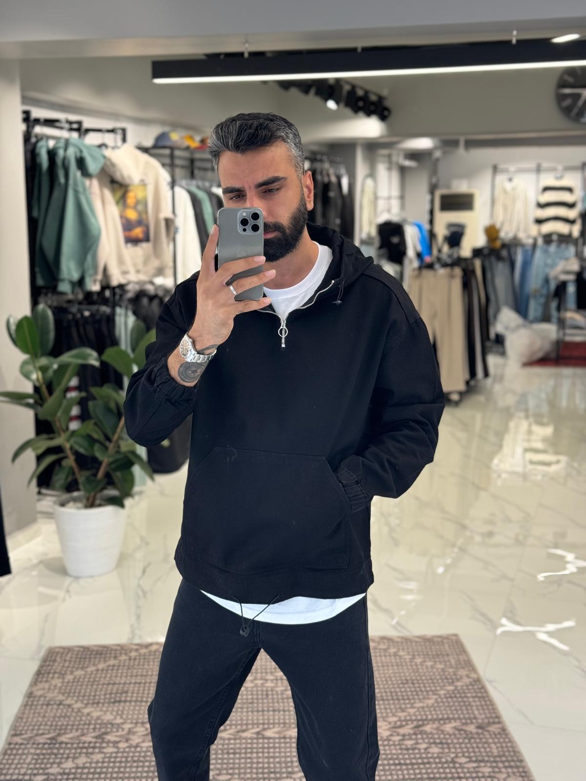 Premium Yarım Fermuar Kot Sweatshirt  Siyah