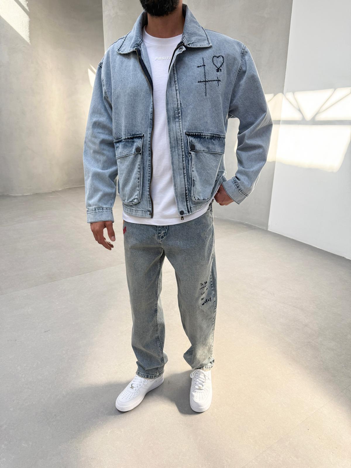 Sırt Baskı Nakış Detaylı Kot Ceket Buz Mavi