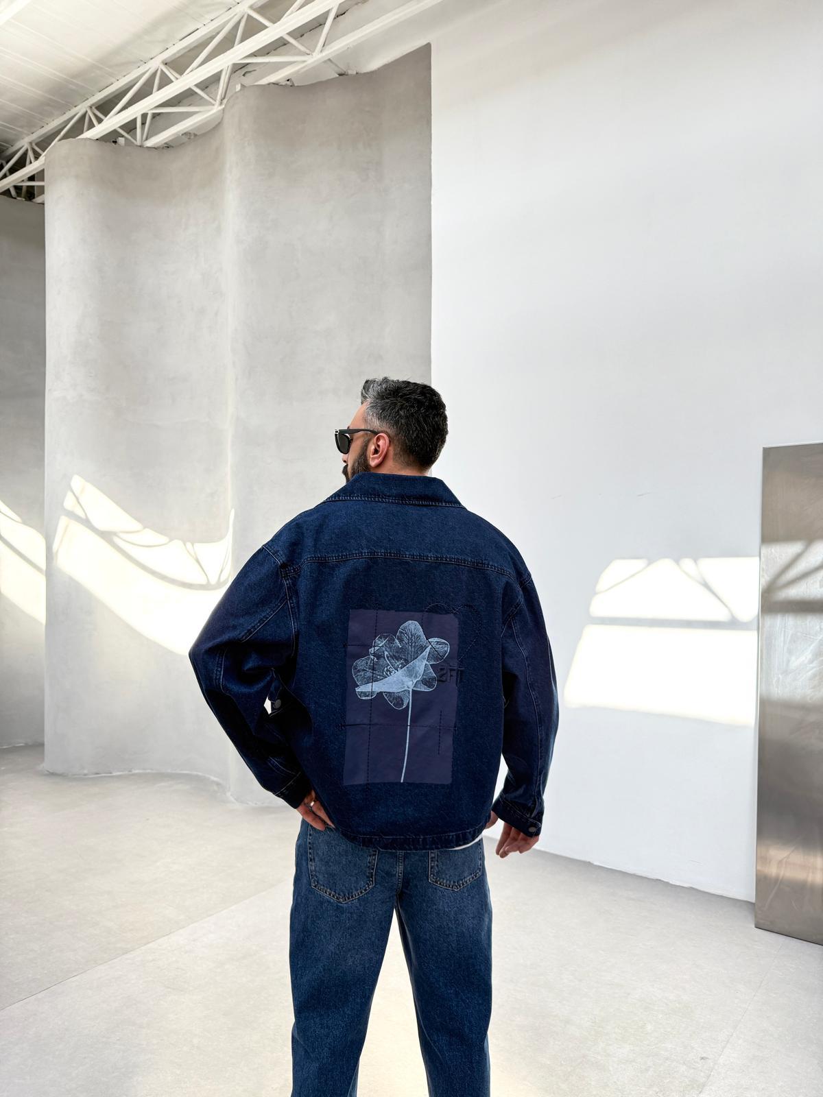 Sırt Baskı Nakış Detaylı Kot Ceket Mavi