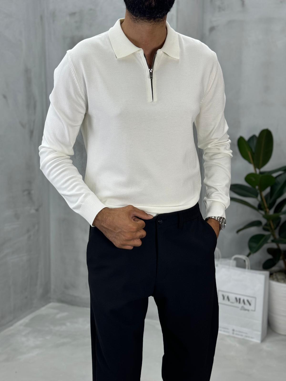 Yarım Fermuarlı Polo Yaka Triko Beyaz