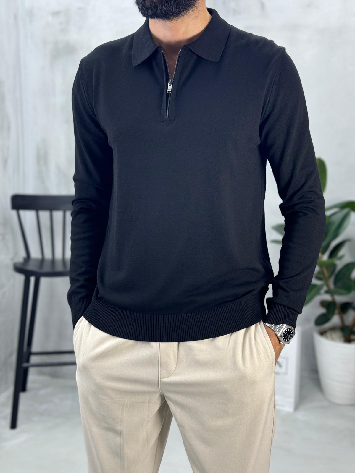Yarım Fermuarlı Polo Yaka Triko Siyah