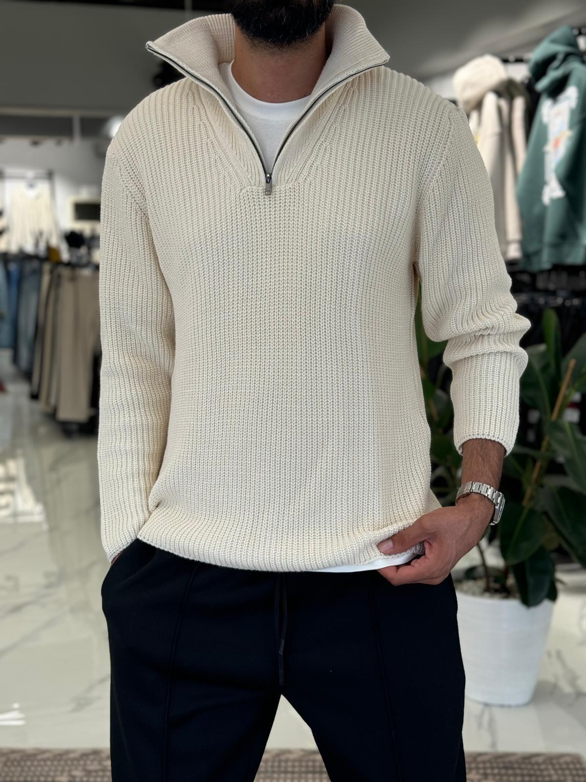 Yarım Fermuarlı Yüksek Yaka Triko Krem