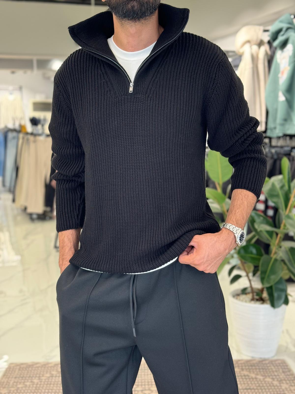 Yarım Fermuarlı Yüksek Yaka Triko Siyah