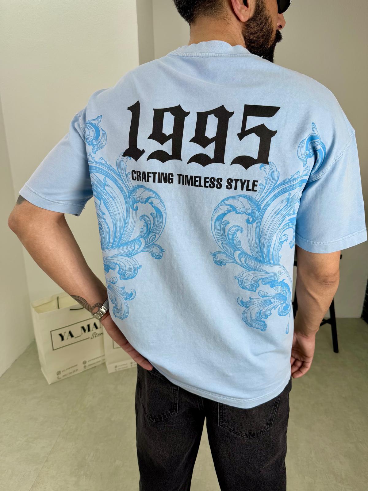 Yıkamalı Baskı Detaylı Oversize T-Shirt Mavi