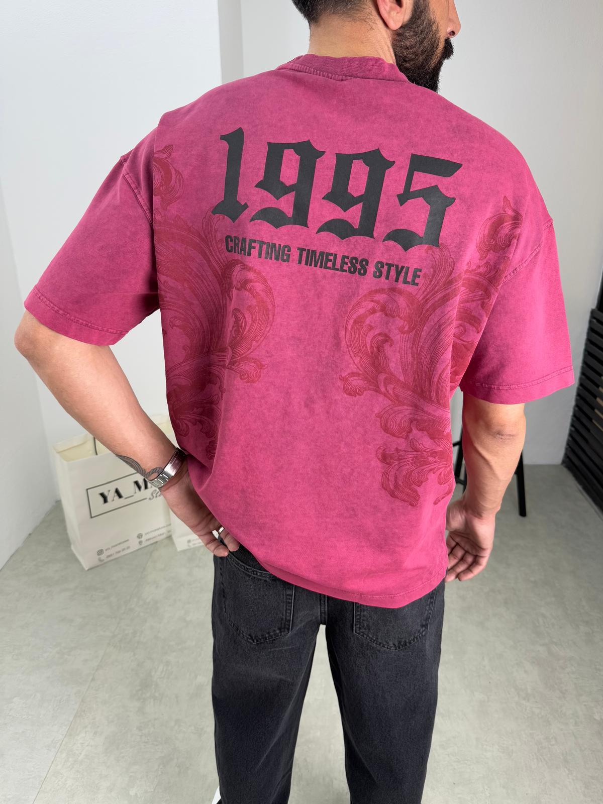 Yıkamalı Baskı Detaylı Oversize T-Shirt Nar Çiçeği