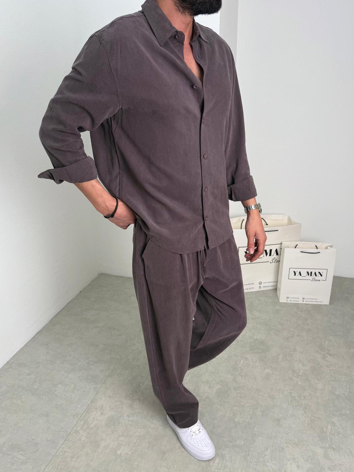 Yıkamalı Tensel Kumaş Pileli Pantolonlu Takım Kahverengi