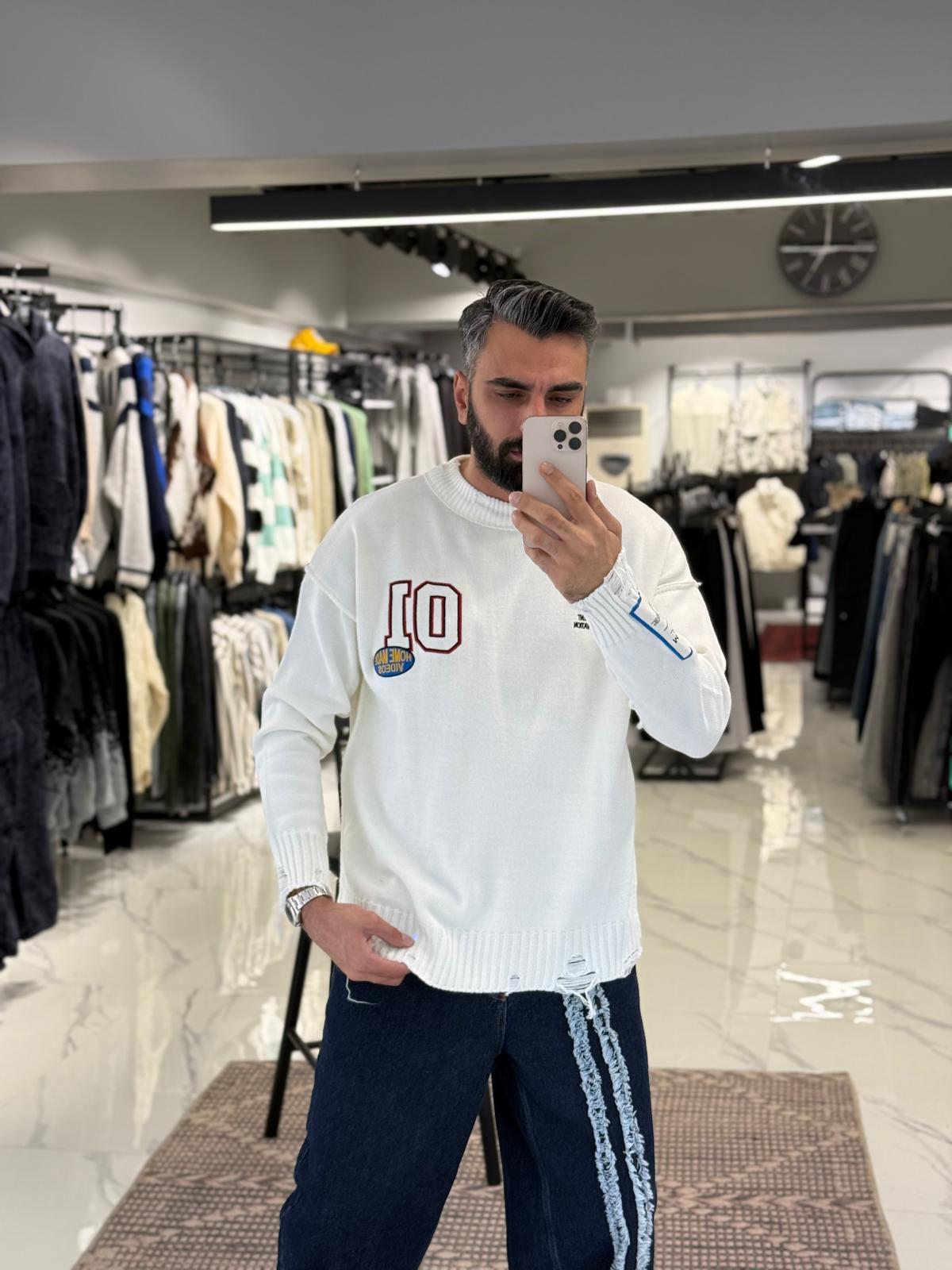 Yırtık Detay Nakış Desen Örme Kazak Beyaz